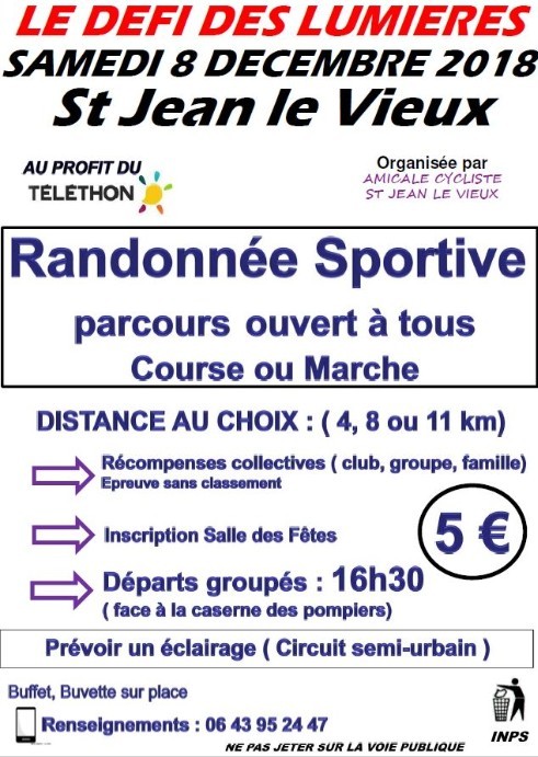 Marche (ou course) nocturne organisée par l'Amicale Cycliste de St Jean le Vieux dans le cadre du téléthon.