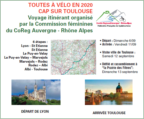 Un voyage cyclo itinérant en 6 étapes au départ de Lyon le dimanche 6 septembre pour rallier Toulouse le vendredi 12, viditer la ville le samedi 13 et participer à la grande randonnée du dimanche, point d'orgue de ce rassemblant national des féminines de la FFVélo.