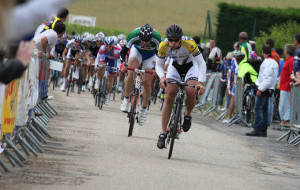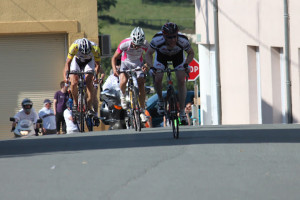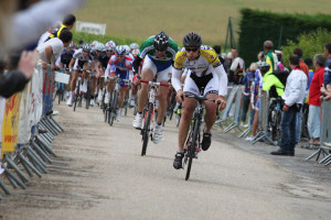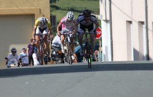 Etape 3 : 38kms, 1 bosse sèche (type Charveyron) à 10 kms de l’arrivée, route mouillée. Vitesse moyenne du 1er, 52 km/h. Objectif de l’étape : maintenir Denis placé au classement général. Après un faux plat montant de 5 kms, le peloton entame une descente très rapide et dangereuse. 2 chutes graves de plusieurs coureurs marquent cette étape. Au bout de 15 kms, le peloton est divisé en 2. Denis, prudent, est dans le 2nd. Cédric le ramène dans le premier peloton, au pied de la bosse. Après la bosse Denis étire fortement le peloton à 55km/h à 9kms de l’arrivée. A 4kms de l’arrivée, Denis s’écarte, Cédric crée la cassure. Cédric gagne l’étape au sprint face au détenteur et vainqueur final du maillot vert et quelques dizaines de mètres devant le peloton (voir article). Les 4 autres sont dans le peloton, mais Sébastien commence à payer ses efforts de la veille quand Denis remonte à la 6ème place du classement général.