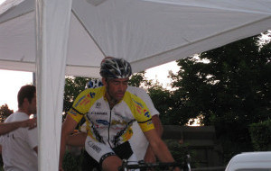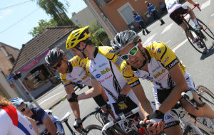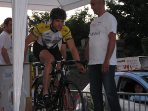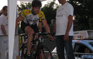 Etape 2 : 98,2kms, 2 ascensions difficiles (3kms et 9 kms), route très vallonnée. Vitesse moyenne du 1er, 40 km/h. Denis et Sébastien sont dans l’échappée de 11 coureurs qui se crée dans la 1er ascension, les 3 autres, comme le peloton, ne peuvent pas répondre. A la fin de cette ascension, une contre-attaque de 12 coureurs se crée, Cédric en fait partie. A la fin de la 2ndascension, il reste 9 coureurs de l’échappée, dont les 2 nôtres, mais Sébastien casse son dérailleur arrière et est contraint de s’arrêter. Cédric est toujours dans la contre-attaque, mais réduite à 6 coureurs. Stéphane abandonnera pour céder son vélo à Sébastien. A l’arrivée, Denis est 7ème, dans le groupe qui a 2min d’avance sur la contre-attaque, 8ème au général. Cédric est 10ème, avec 2min d’avance sur le peloton. Preuve qu’il était en forme, Sébastien finit à 7min du vainqueur, mais après avoir repris 3 minutes en solitaire, sur les 25 derniers kilomètres. Jérôme nous résume sa journée par « qu’est-ce que je fais là ! ».