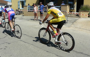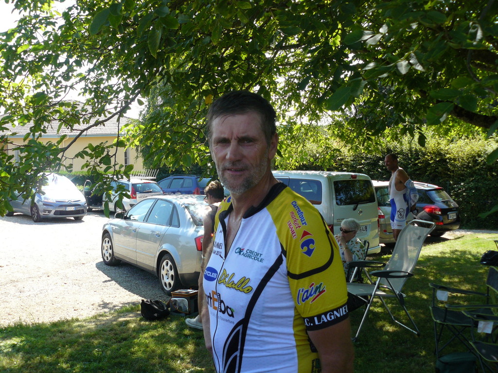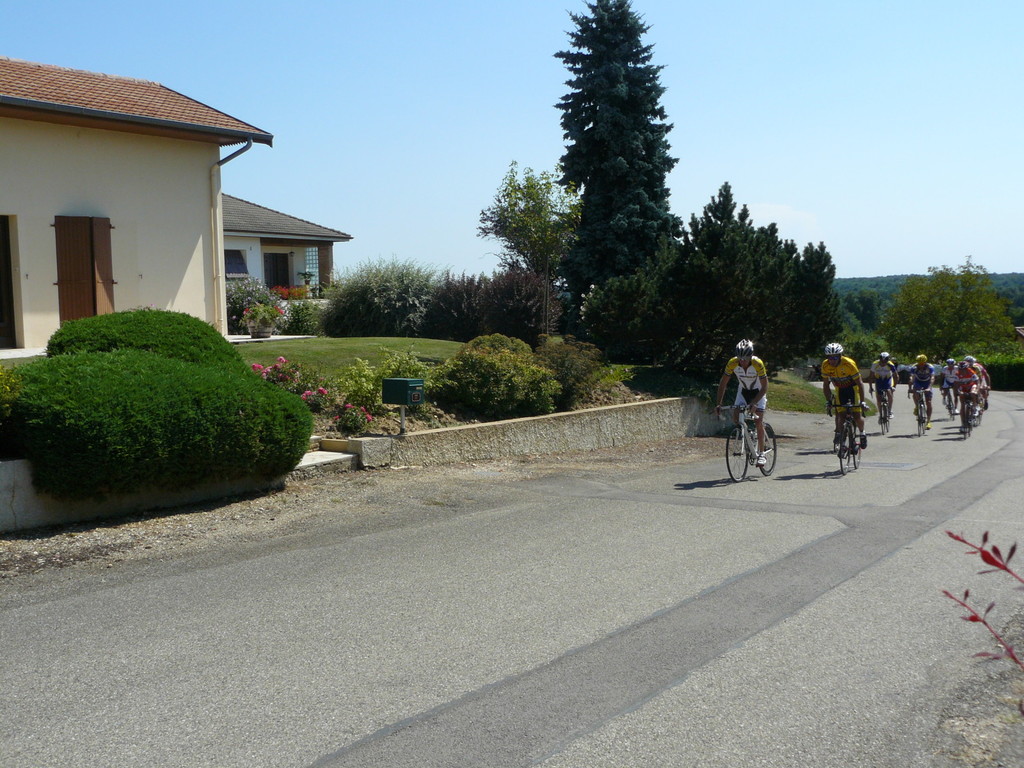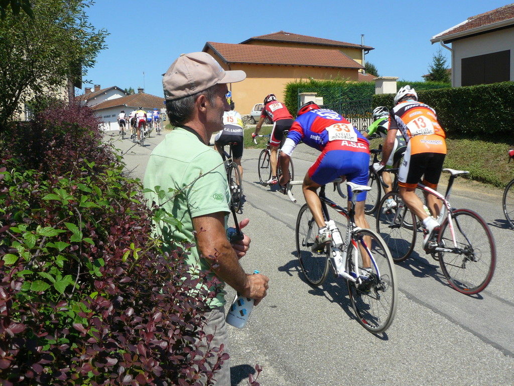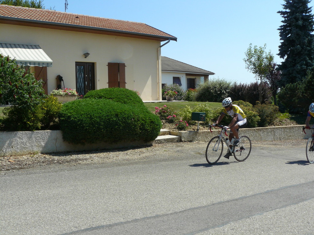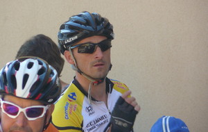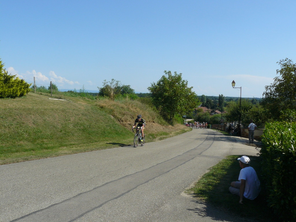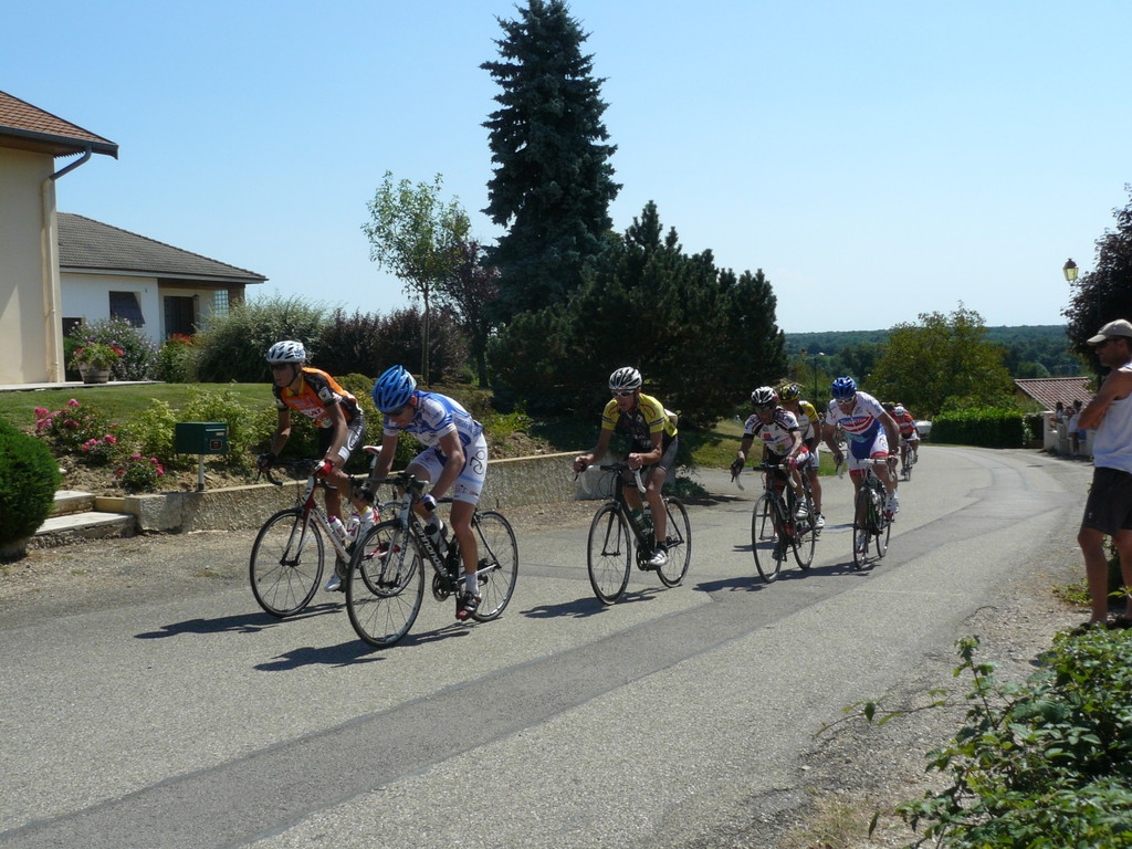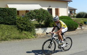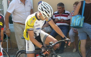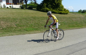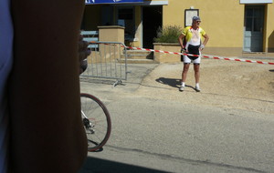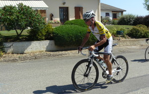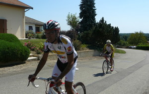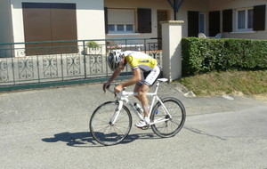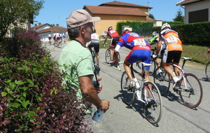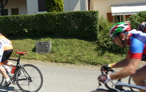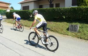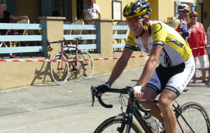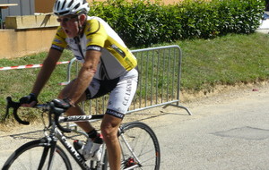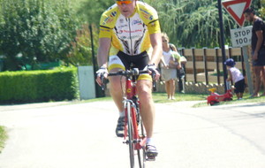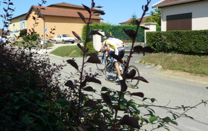 à 2 tours de l'arrivée fut décroché dans la longue bosse précedant l'arrivée. A l'entrée de Chaveyriat étant à une centaine de mètres du groupe se lança dans la descente à fond, malheureusement il tira tout droit au 1er virage. Dégouté il préféra abandonner.