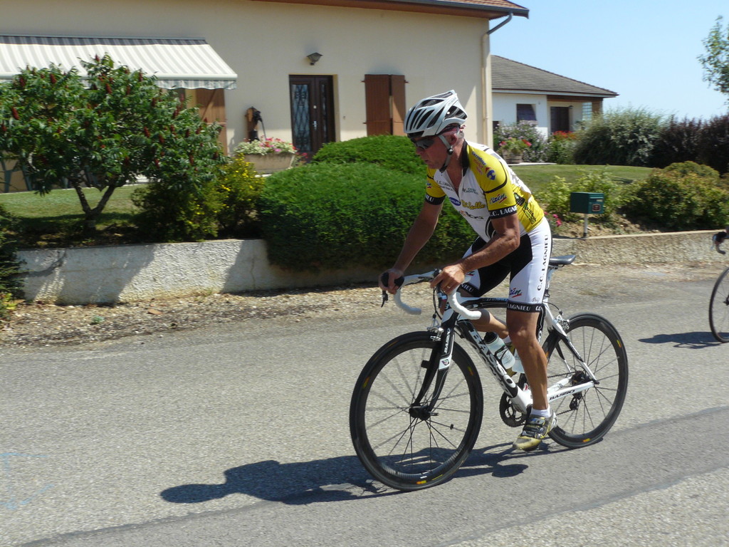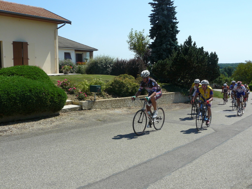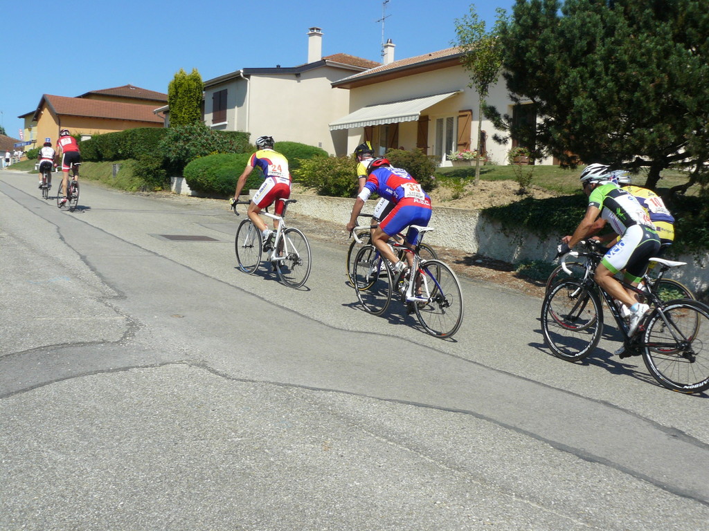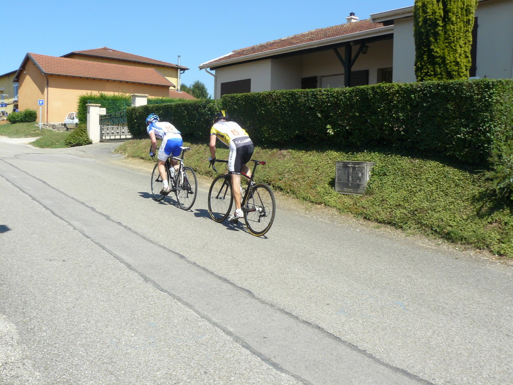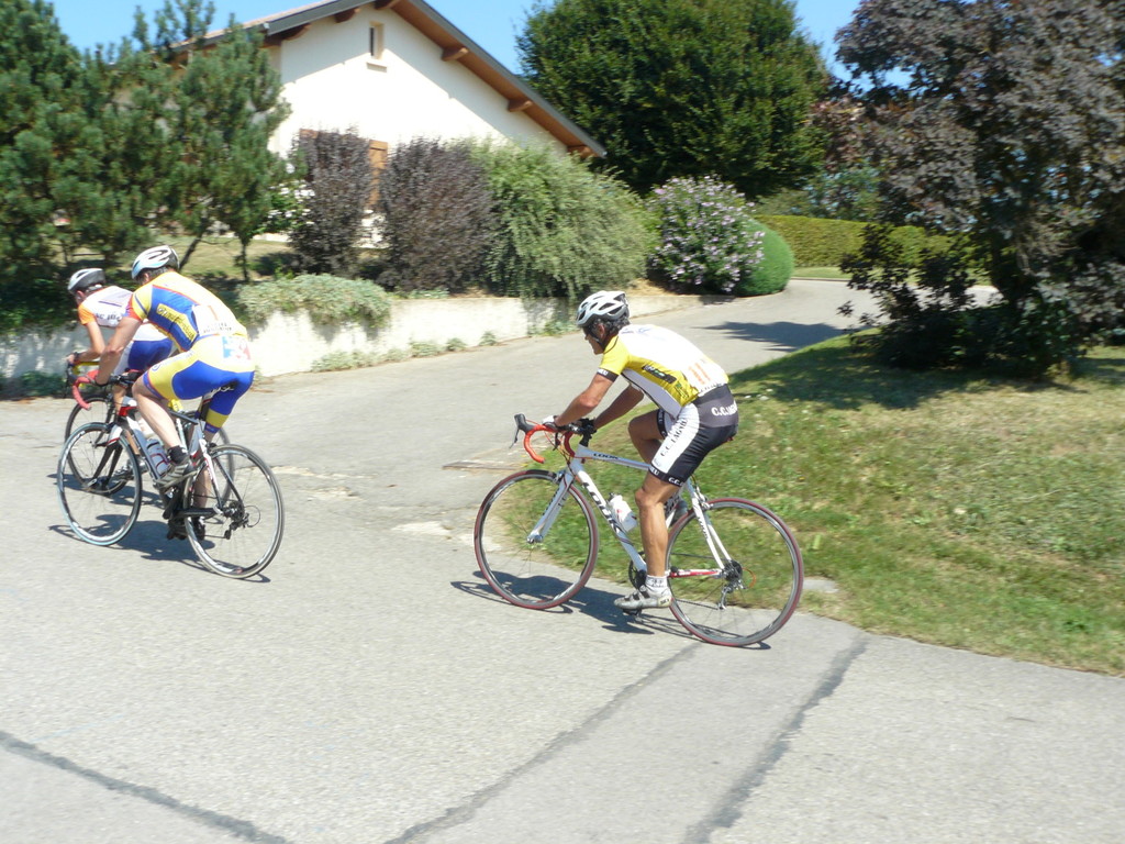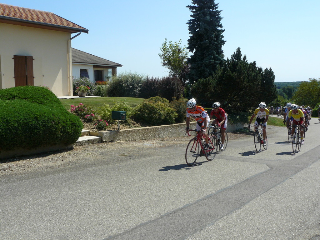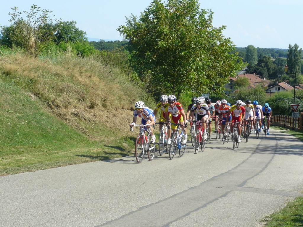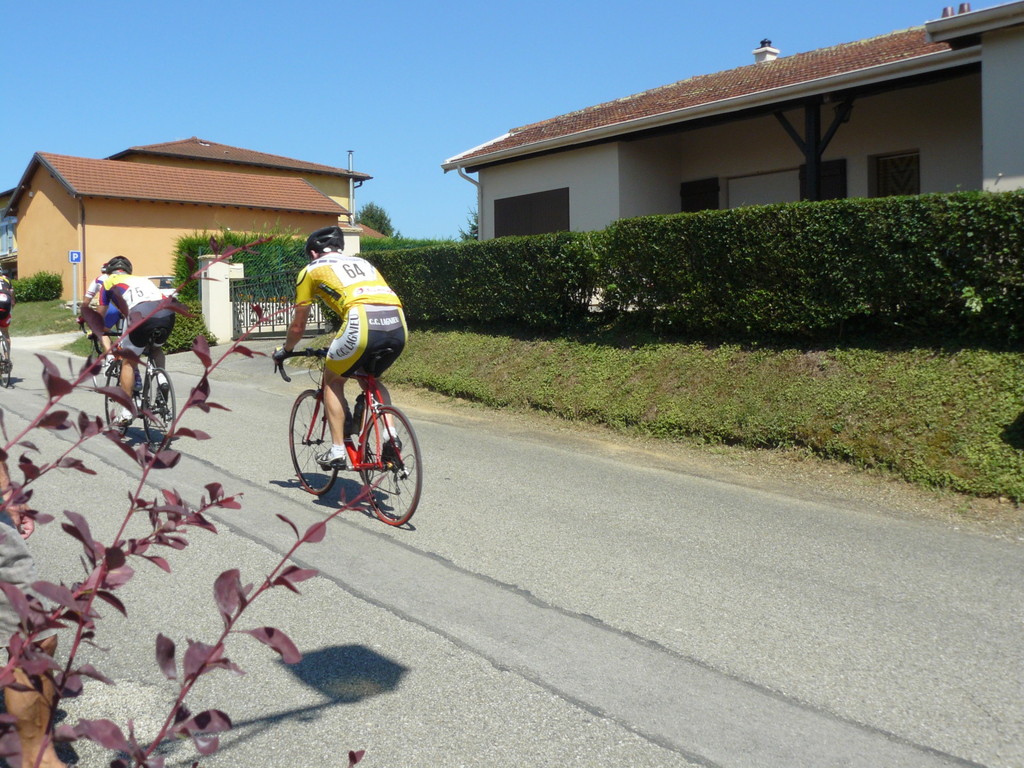 à 2 tours de l'arrivée fut décroché dans la longue bosse précedant l'arrivée. A l'entrée de Chaveyriat étant à une centaine de mètres du groupe se lança dans la descente à fond, malheureusement il tira tout droit au 1er virage. Dégouté il préféra abandonner.