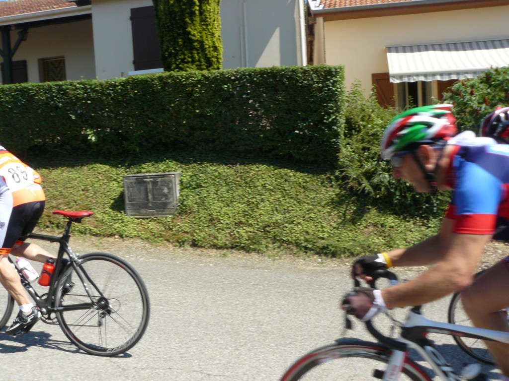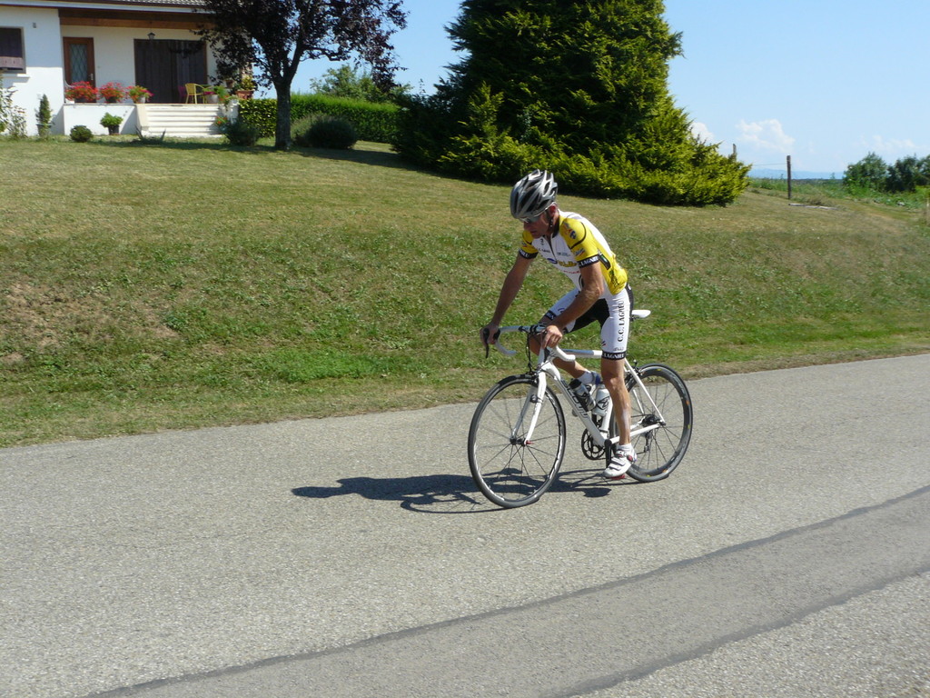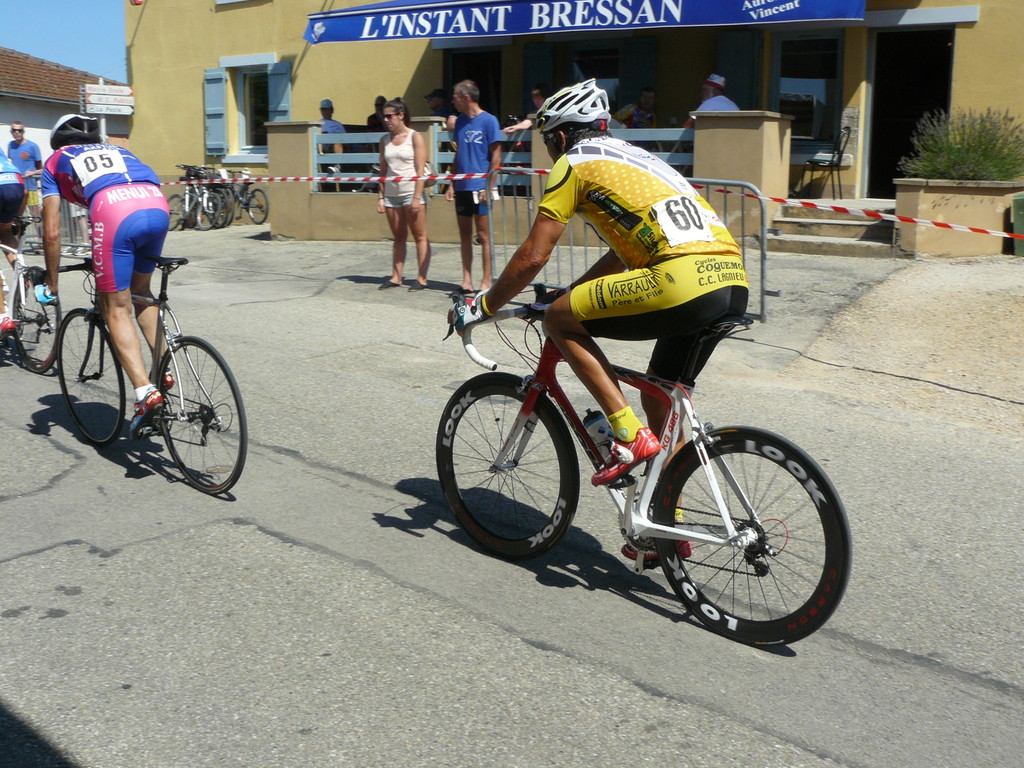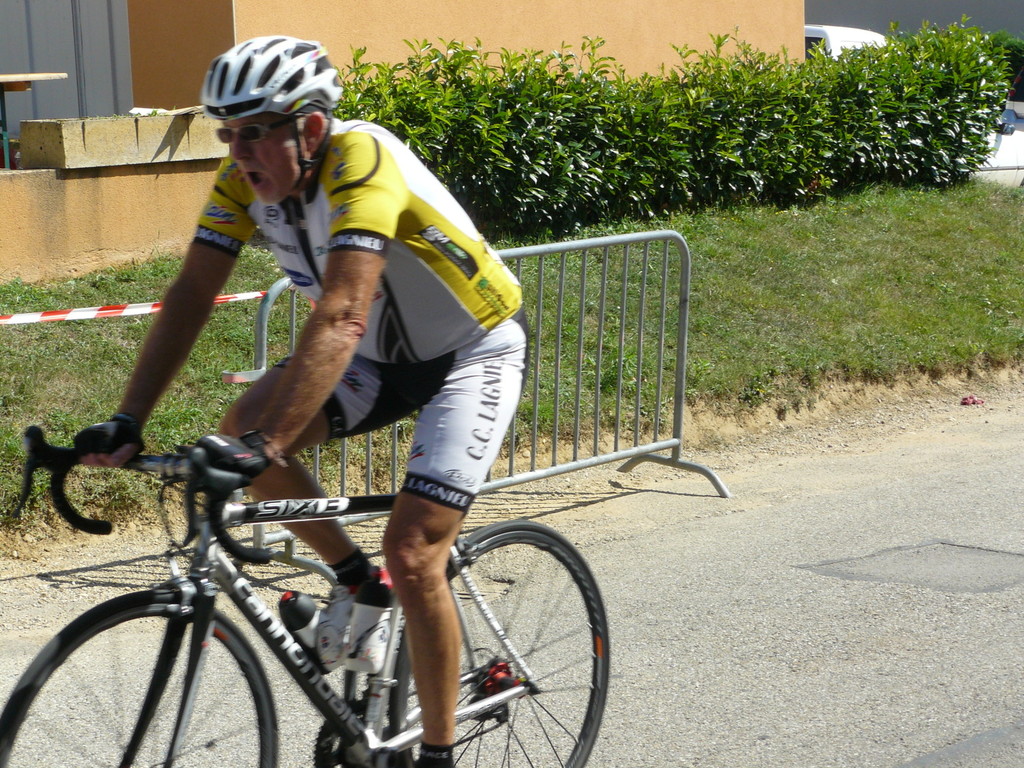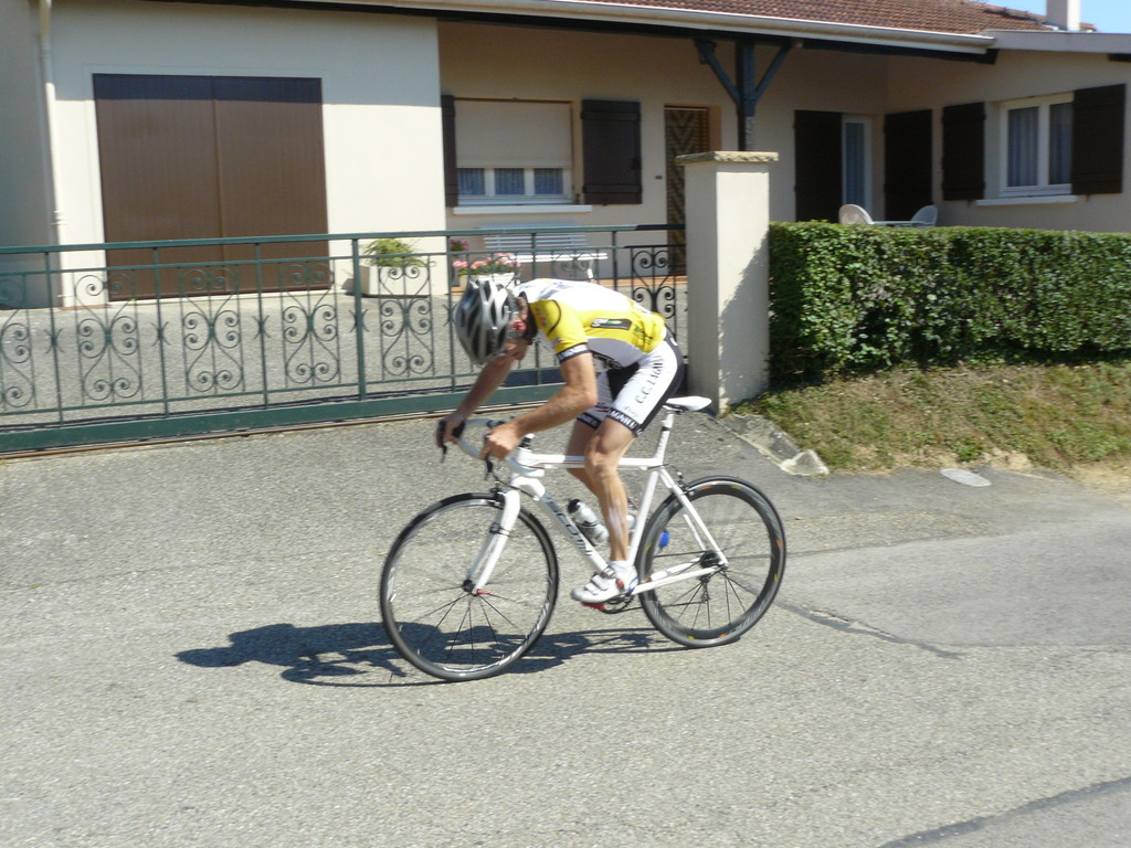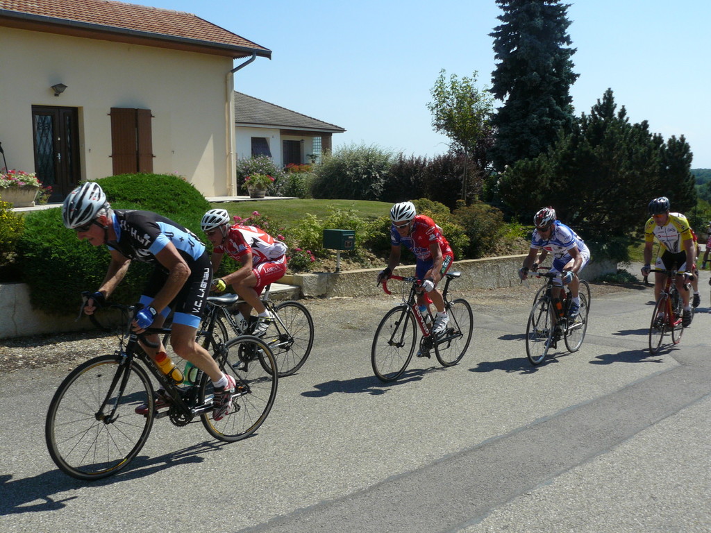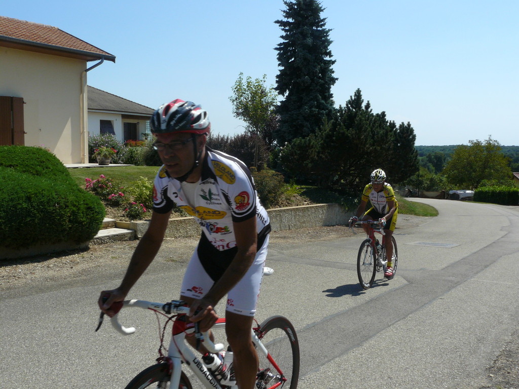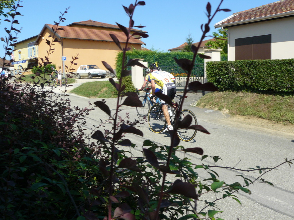 à 2 tours de l'arrivée fut décroché dans la longue bosse précedant l'arrivée. A l'entrée de Chaveyriat étant à une centaine de mètres du groupe se lança dans la descente à fond, malheureusement il tira tout droit au 1er virage. Dégouté il préféra abandonner.