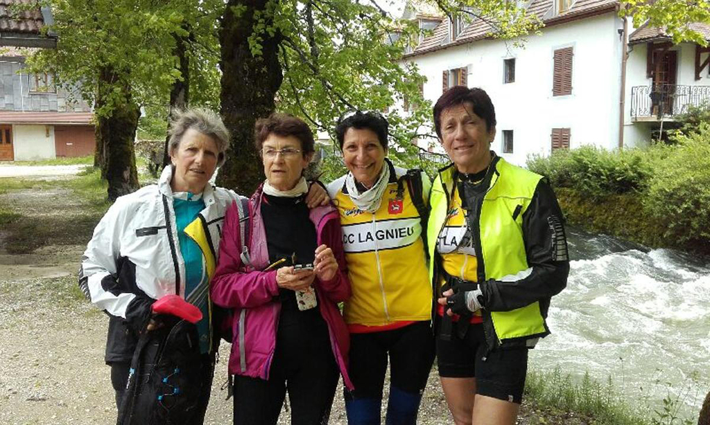 Départ effectif à 9h30' par groupes (11 au total) ; la pluie s'est calmée vers 11h ; pique-nique prévu à Massignieux de Rives, mais compte tenu du temps, les organisateurs doivent trouver une salle pour nous permettre de déjeuner à l'abri. Départ après le repas, à nouveau sous une pluie battante, direction Cormaranche, Hauteville par le Col de la Lèbe. Nous étions logées dans des auberges de jeunesse, mobile-homes, hôtels : en règle générale, il n'y avait rien à dire sinon que les vêtements et chaussures n'étaient pas secs pour le départ du lendemain ; il ne fallait pas être trop fragiles mais on aura des souvenirs ...