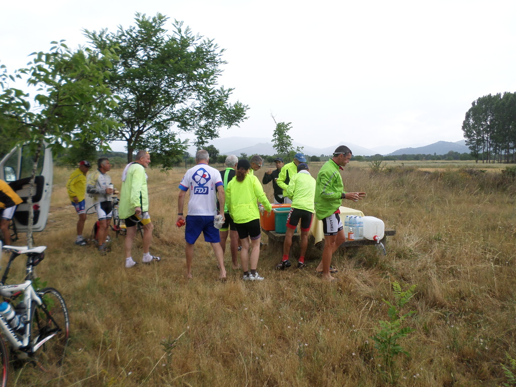 Au 111ème km enfin la pause repas... sous la pluie. Repas avalé vite fait et du coup il est resté du rosé !