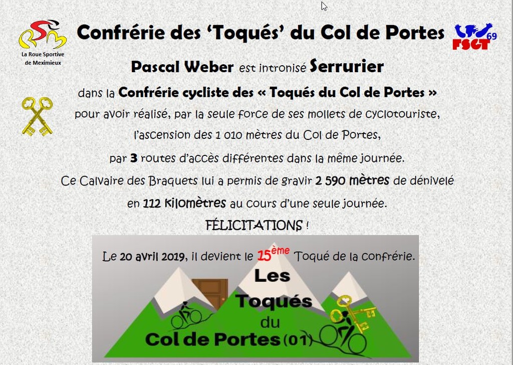 Avec 4 cyclos ayant réalisé chacun trois ascensions du Col de Portes pour atteindre le grade de "Serruriers", le CC Lagnieu s'empare de la 1ère place du classement par clubs de la toute nouvelle Confrérie des Toqués du Col de Portes, dès le jour de l'inauguration samedi 20 avril.