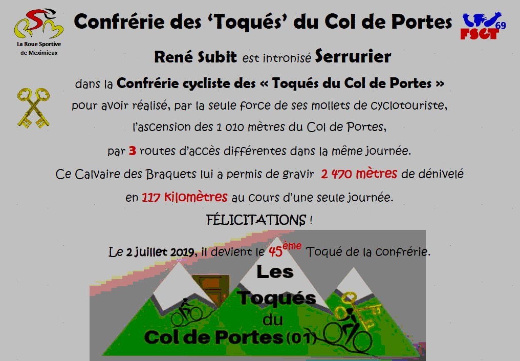 Mettant à profit une légère baisse de la température dûe aux orages de la soirée précédente, René a tenté l'aventure mardi 2 juillet et est devenu le 8ème membre du CCL Toqué du Col de Portes avec trois ascensions, réalisant dans l'ordre les grimpées par Montagnieu, Contrevoz puis Serrières de Briord.